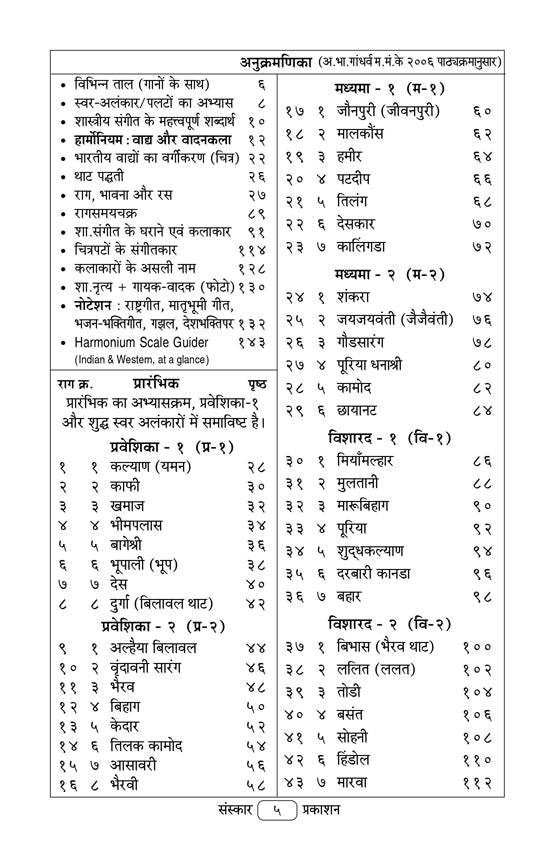 Book also includes topics like 1) the ‘10 Thaats’ with their scale, 2) different ‘Taals’ with a famous song on that Taal, 3) permutations of major scales for practice (Shuddha Swar Alankars), 4) a table based on notes relating to Indian and Western Classical style of notes, 5) introduction to ‘Gharanas’, 6) Table of classification of Ragas (Raag-Samaychakra), 7) various dance forms of India with Images, 8) Harmonium instrument's history as well as its playing technique and caretaking points are also given along with images.